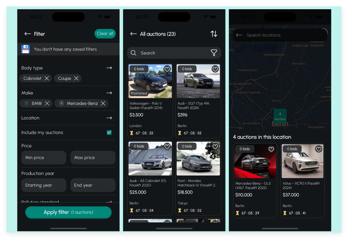 - 带有拍卖定位器的地图屏幕 :用户可以通过访问专用地图屏幕轻松