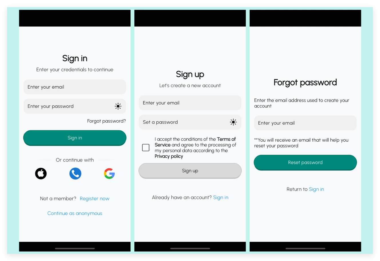 和匿名登录。包括 「忘记密码」 功能。 - 介绍屏幕 :可跳过的
