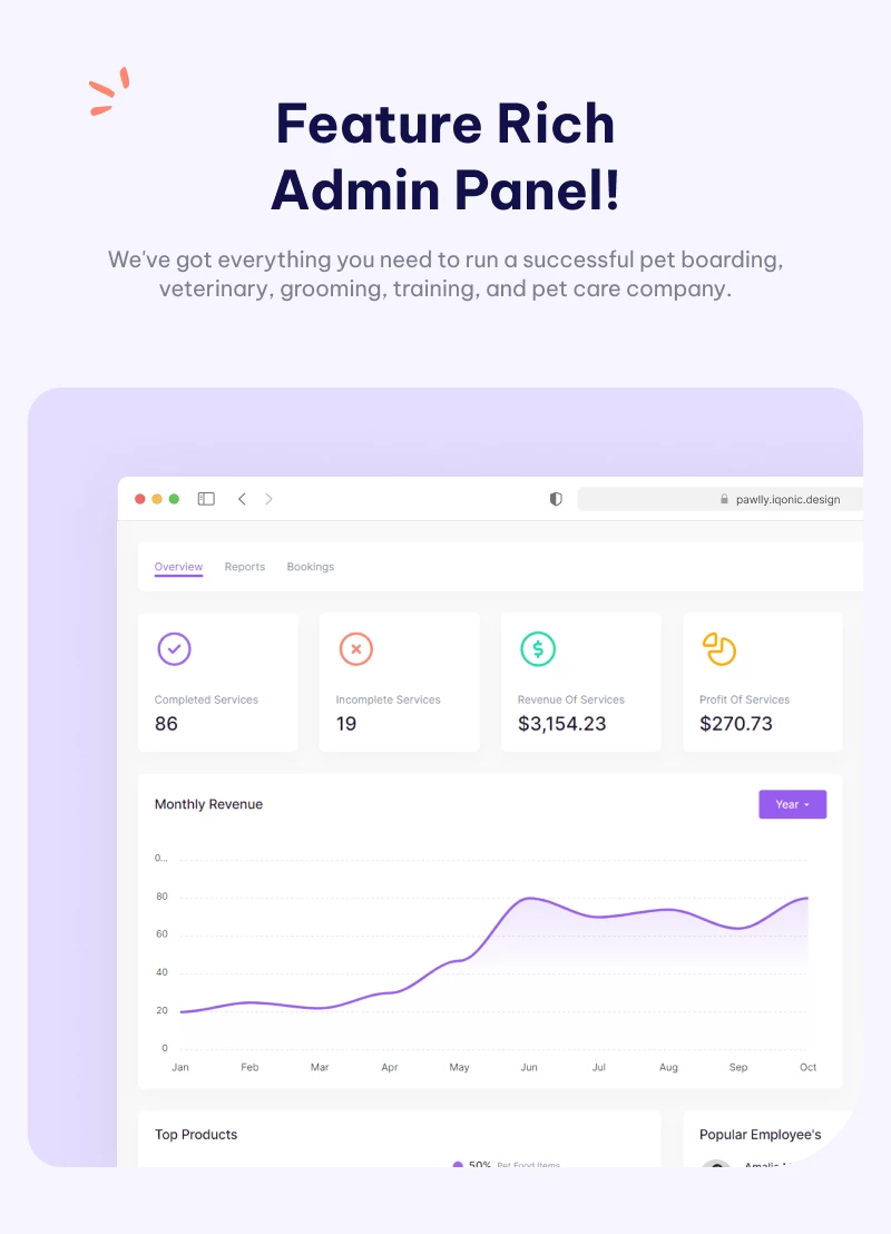 使用 Laravel 9 和 Vue.js 3 技术构建。管理面板充当神经中枢,允许管理员监督员工、客户及其宠物。它有助于有效管理员工收入、客户评论、活动、博客和通知设置。强调数据安全,可以对角色和权限进行微调,以确保最佳的访问控制。管理面板还提供全面的预订管理工具,使管理员能够协调无缝服务交付。