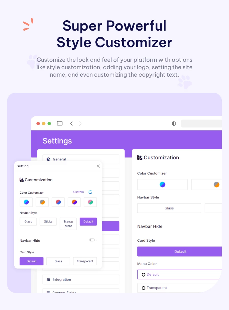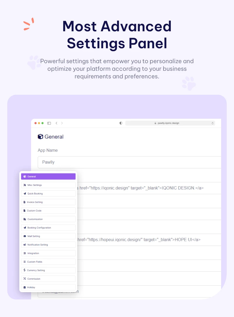 考虑了全球受众。它 支持多种语言 ,包括阿拉伯语、法语、印地语、德语和英语。移动应用程序和管理面板提供 深色 和浅色模式 以满足用户偏好,增强可用性和可访问性。定制是 Pawlly 体验的核心。管理面板具有 Hope UI 的强大功能,这是一个开源的企业级管理模板。这种集成使管理员能够 个性化平台 的外观,包括颜色、菜单样式和卡片设计,而无需开发人员干预。可以通过管理面板直观的设置界面轻松管理业务信息、徽标、邮件设置和时区。