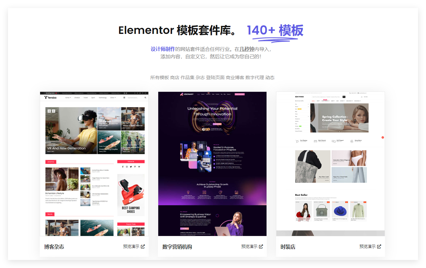 、扩展、页眉页脚生成器、弹出窗口生成器、模板和块。附带 90+ Elementor 插件、 100+ Elementor 模板套件 (每周增长) 、主题生成器、WooCommerce 生成器