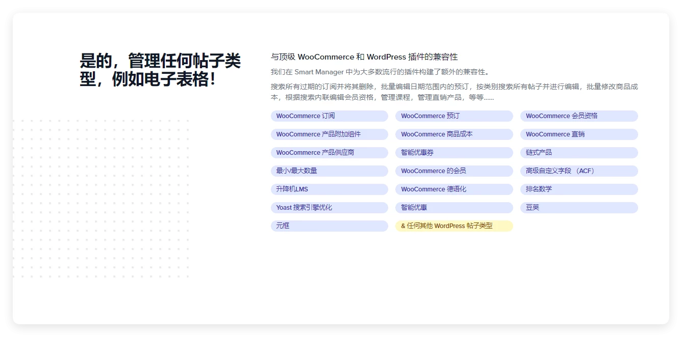 使用同一个类似表格的界面来查看、管理和批量编辑所有类型的自定义帖子类型和自定义分类法。 Smart Manager 也支持许多第三方插件数据类型!这就是为什么它是一个流行的 WordPress 和 WooCommerce 高级批量编辑插件。