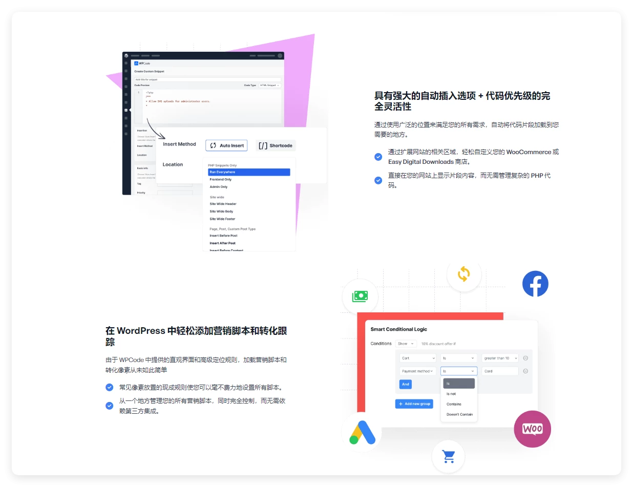 完全支持自定义 PHP 、 JS 、 CSS 、 HTML 、文本和其他类型的自定义代码片段。