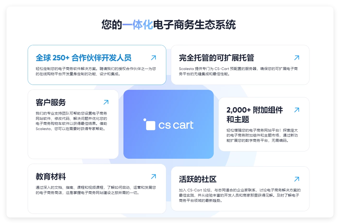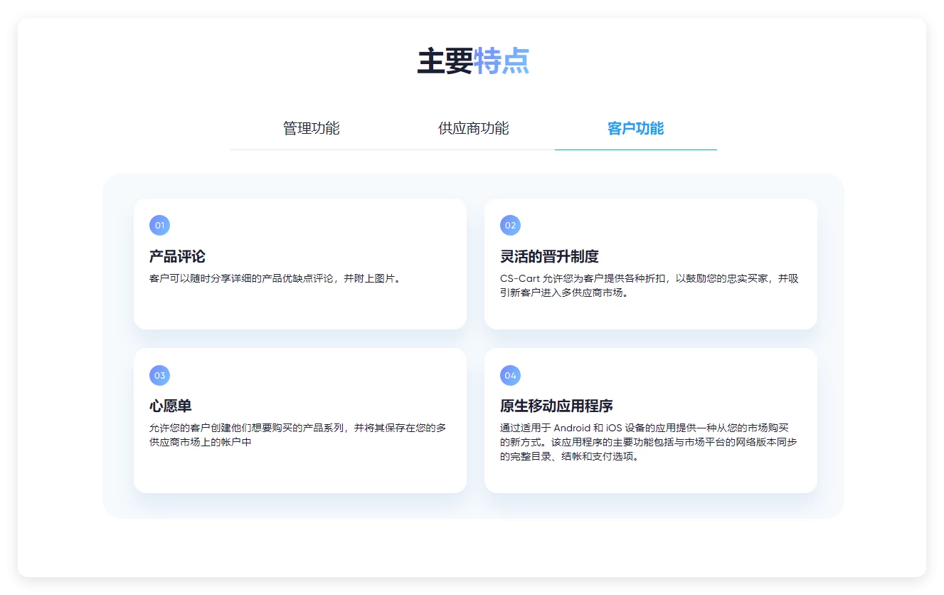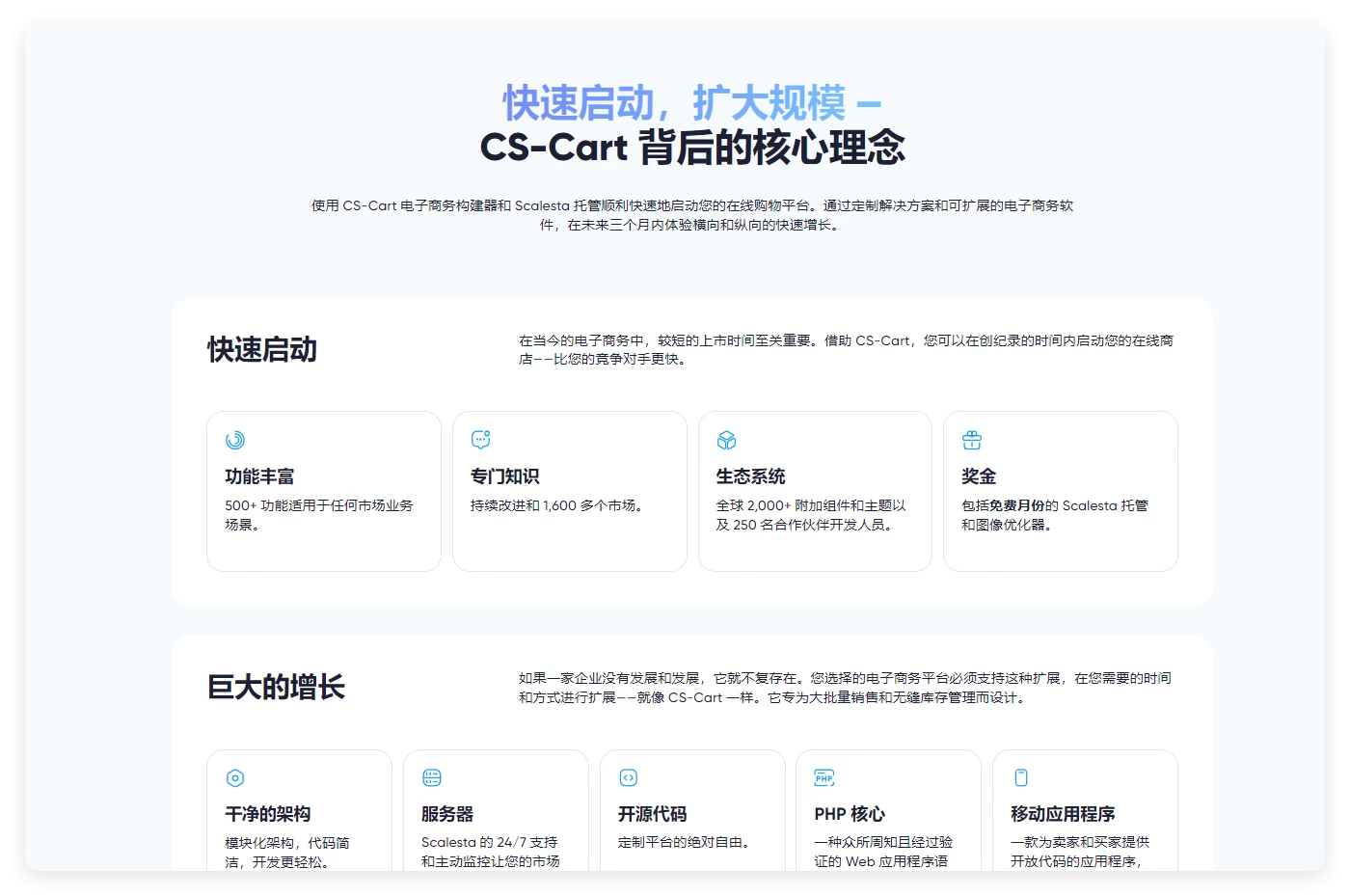 我们对市场网站建设者进行了研究,结果表明 CS-Cart Multi-Vendor 软件开箱即用,具有最完整的功能范围。市场包足以启动并成功开发和构建您的项目。