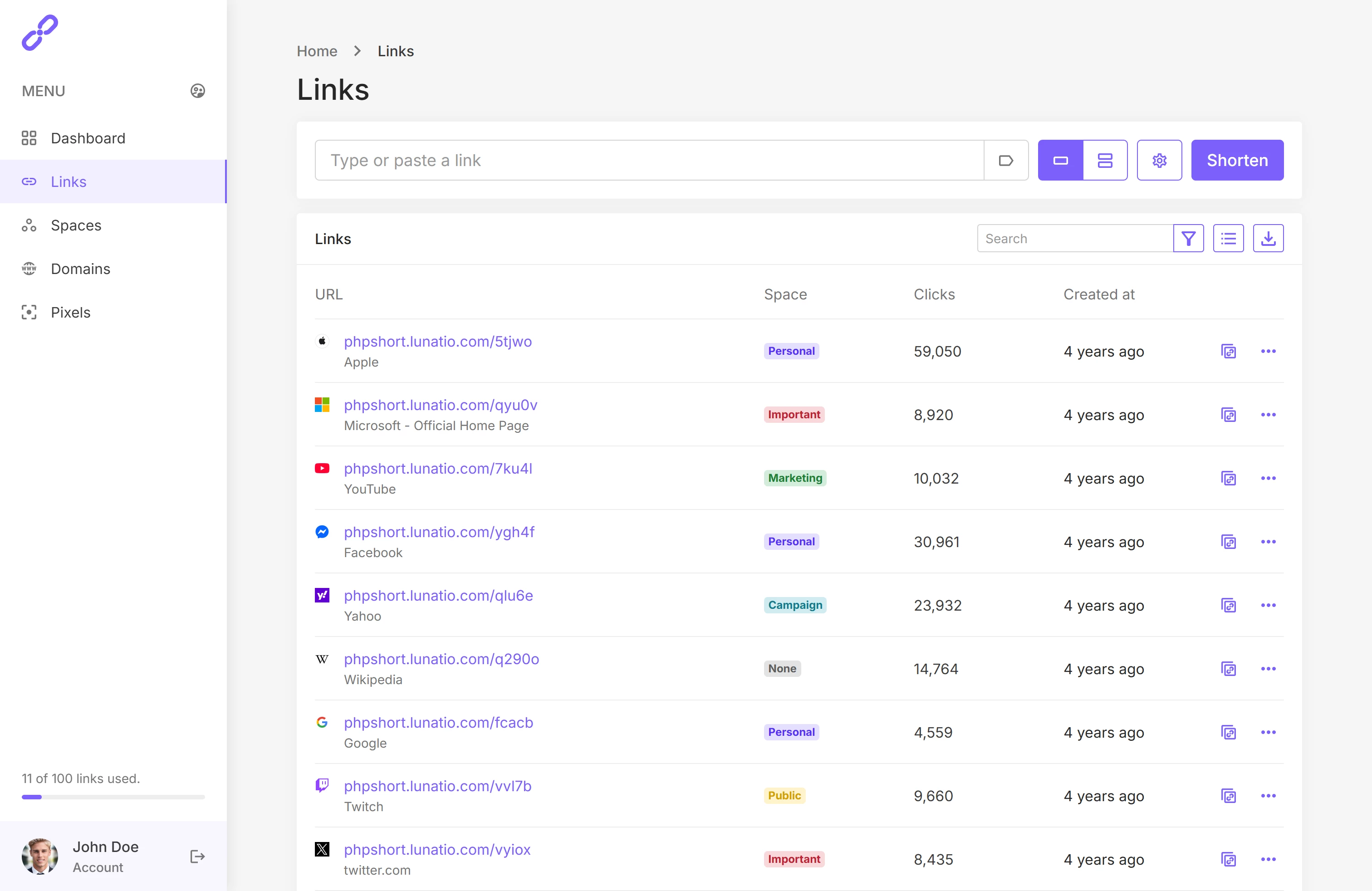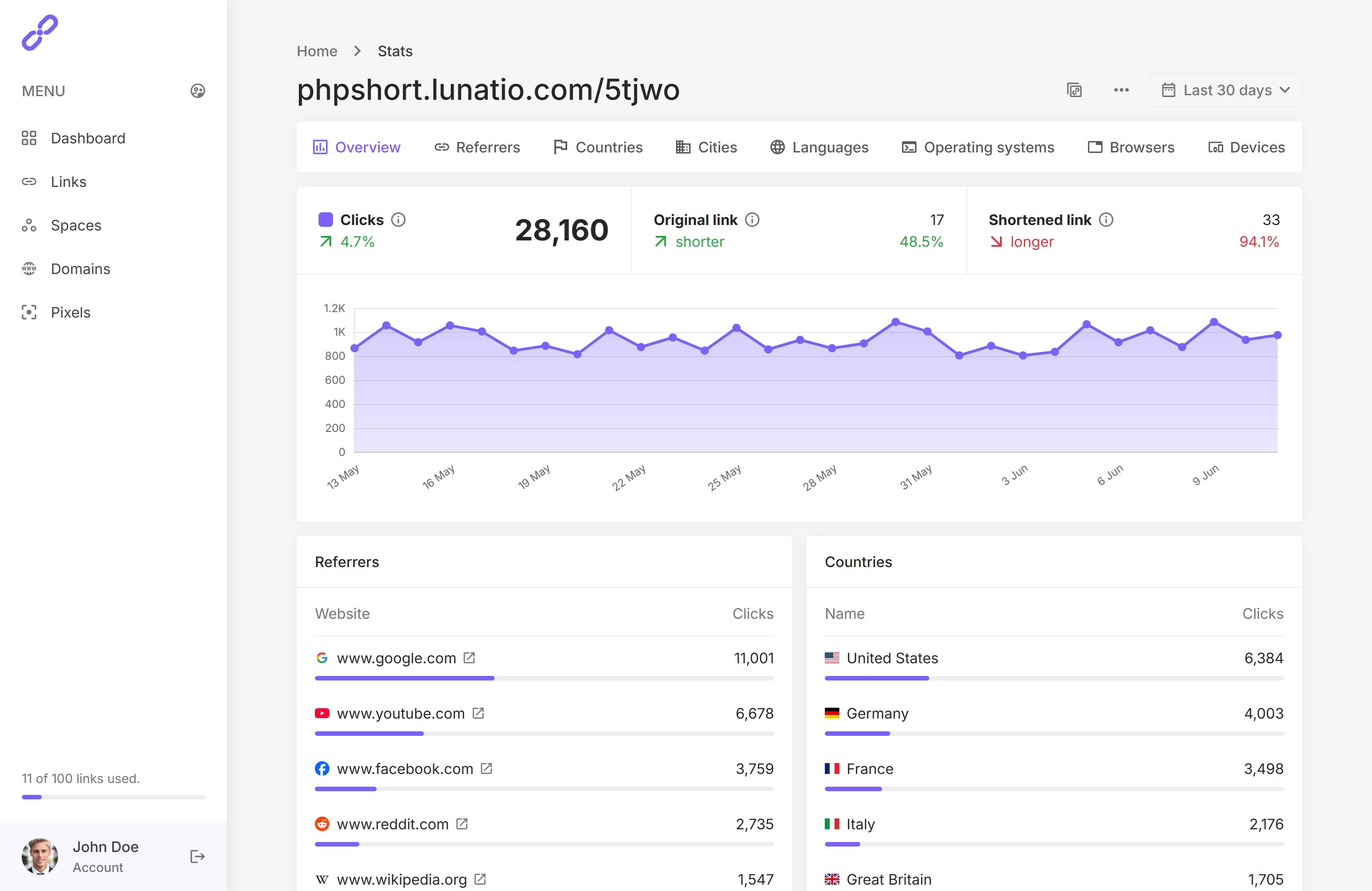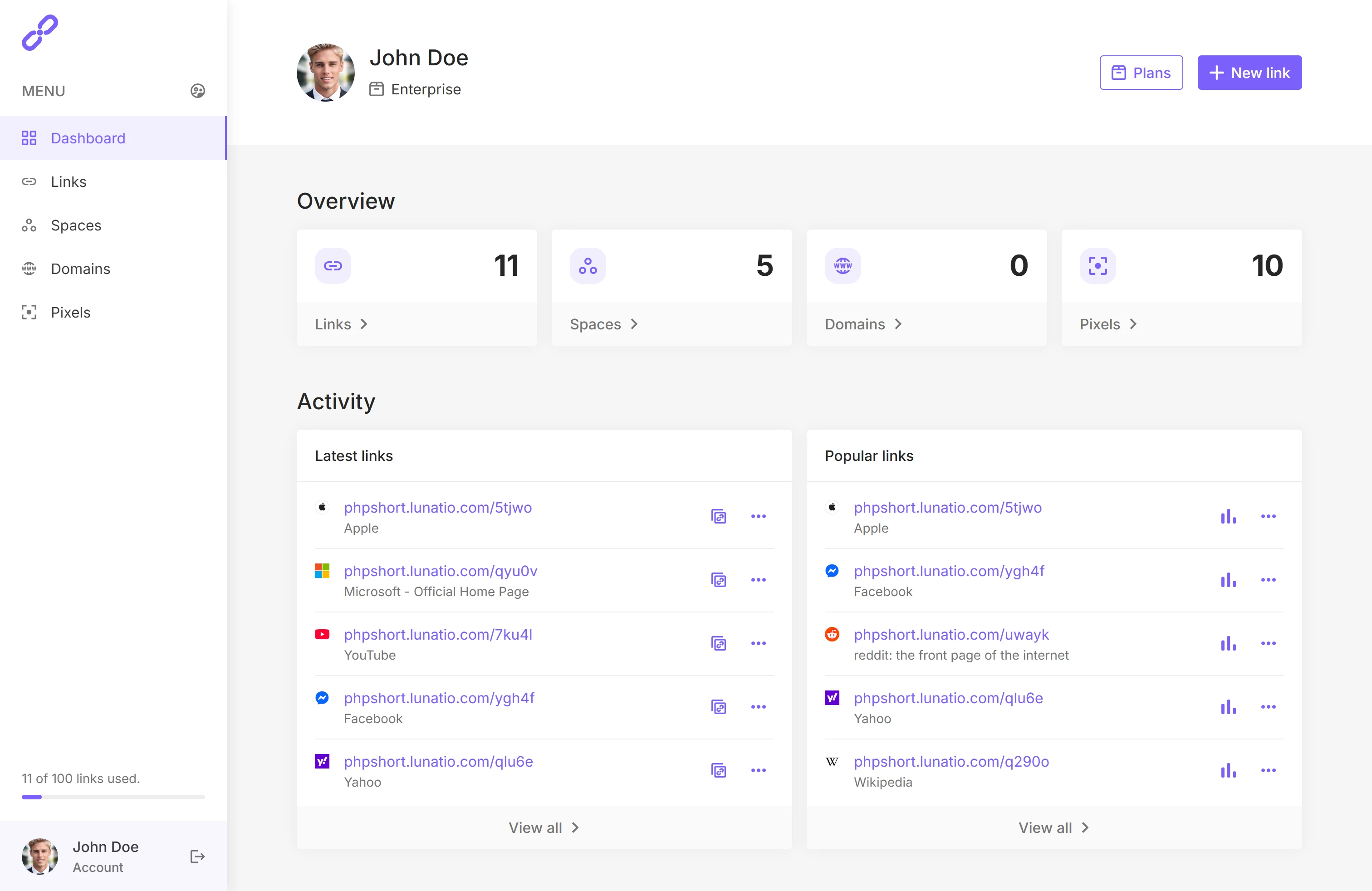 - 仪表板:直观展示账户整体情况,可快速管理最新创建或访问量最高的链接。