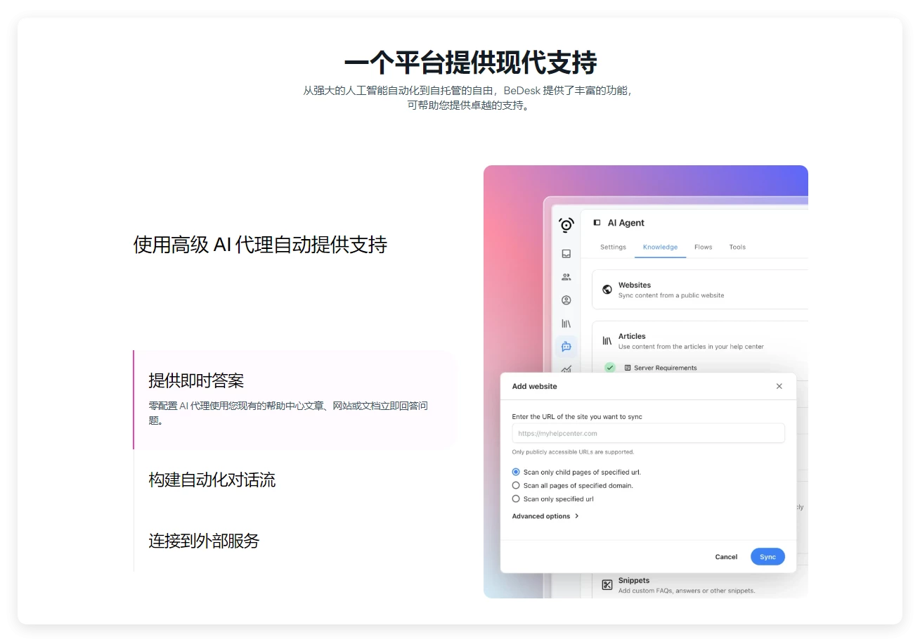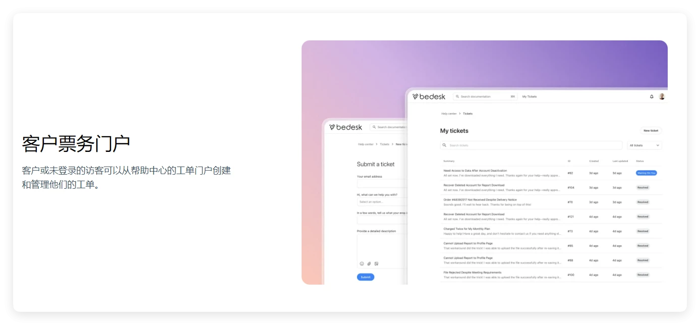 它可以自动将电子邮件转换为工单 / 回复,并将从 BeDesk 做出的代理回复作为电子邮件发送。客户还可以直接从 BeDesk 网站创建工单并回复。
