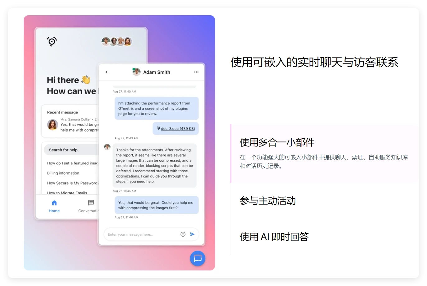 - 通知 – 通过电子邮件、浏览器或移动设备接收有关各种事件的通知,包括新工单、新回复、已分配工单等。