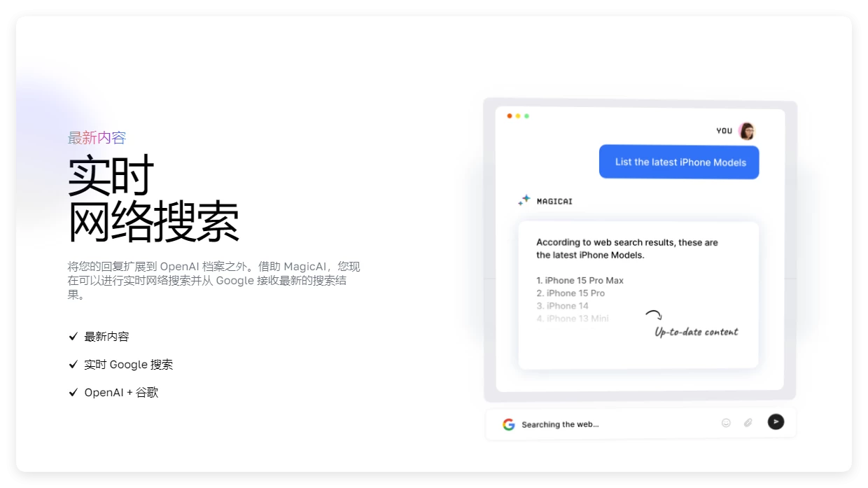 将您的回复扩展到 OpenAI 档案之外。借助 MagicAI,您现在可以进行实时网络搜索并从 Google 接收最新的搜索结果。