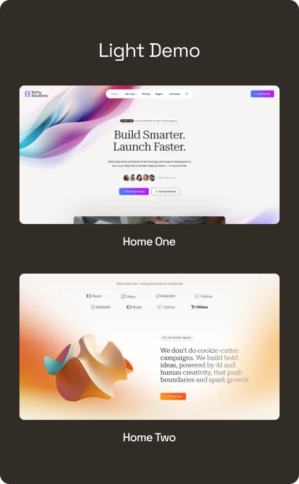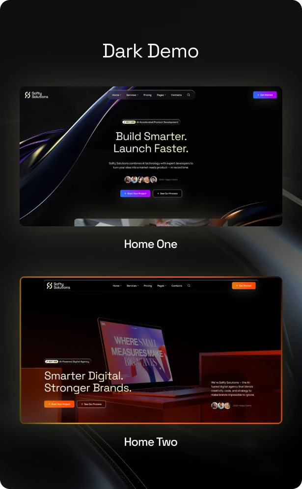 Softy Solutions 提供两个完整的浅色和深色风格演示,每个演示都有两种不同的主页变体,为您的科技品牌提供充分的创意灵活性。
