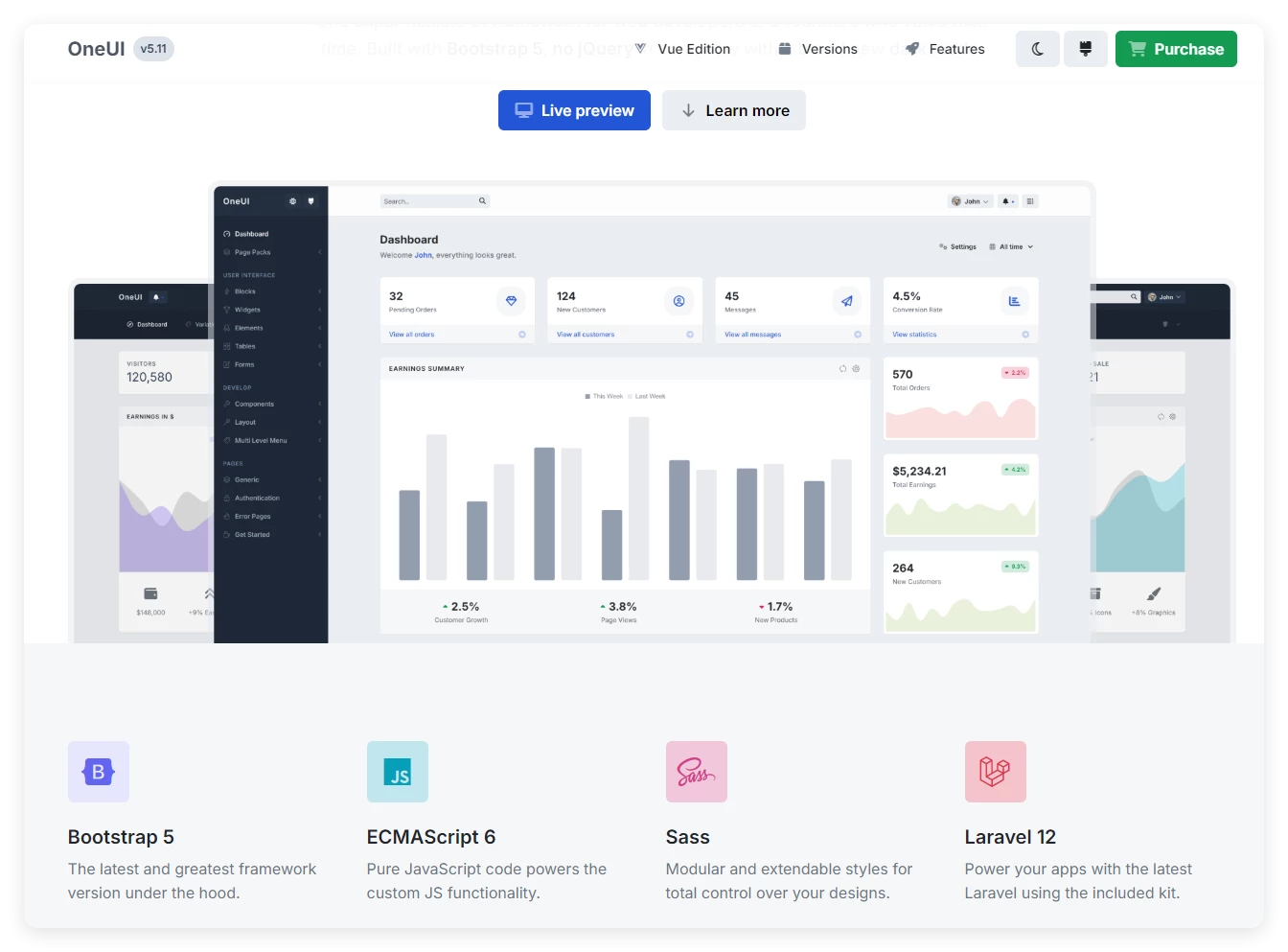 OneUI 5.9 – Bootstrap 5 后台管理仪表板模板、Vue 版和 Laravel 11 入门套件
