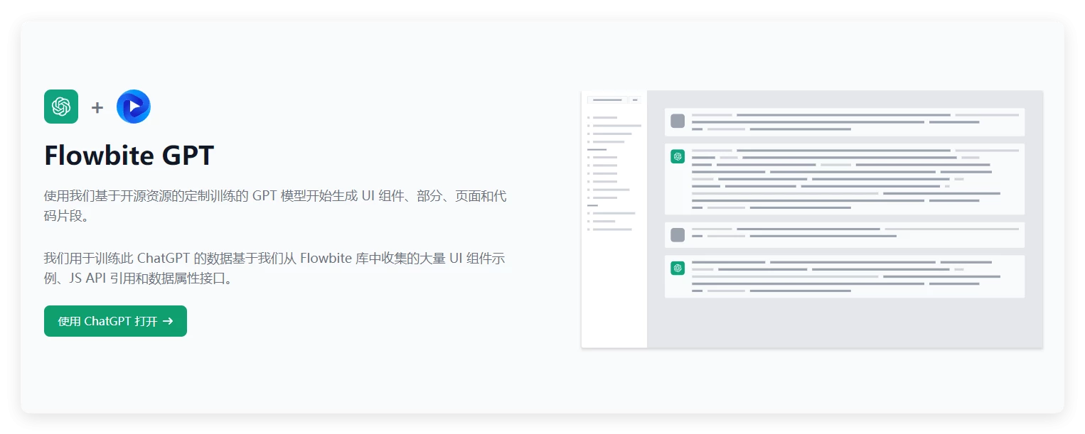 Flowbite GPT 中的人工智能功能可帮助用户自动创建新的网站元素和页面,从而简化界面的设计和样式过程。 Flowbite Pro 为您提供了所有组件,可以有效地为管理仪表板、电子商务平台和个人网站设计高质量的可视化界面。