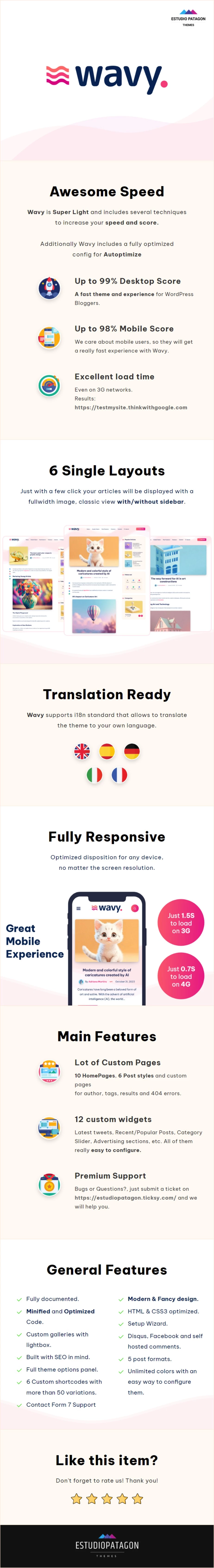 Wavy 完全兼容 AMP 的过渡模式 (主页、存档、作者和单篇帖子),支持多语言,支持英语 和西班牙语。你可以轻松将主题翻译成任何你想要的语言。 Wavy 也支持 RTL 语言。